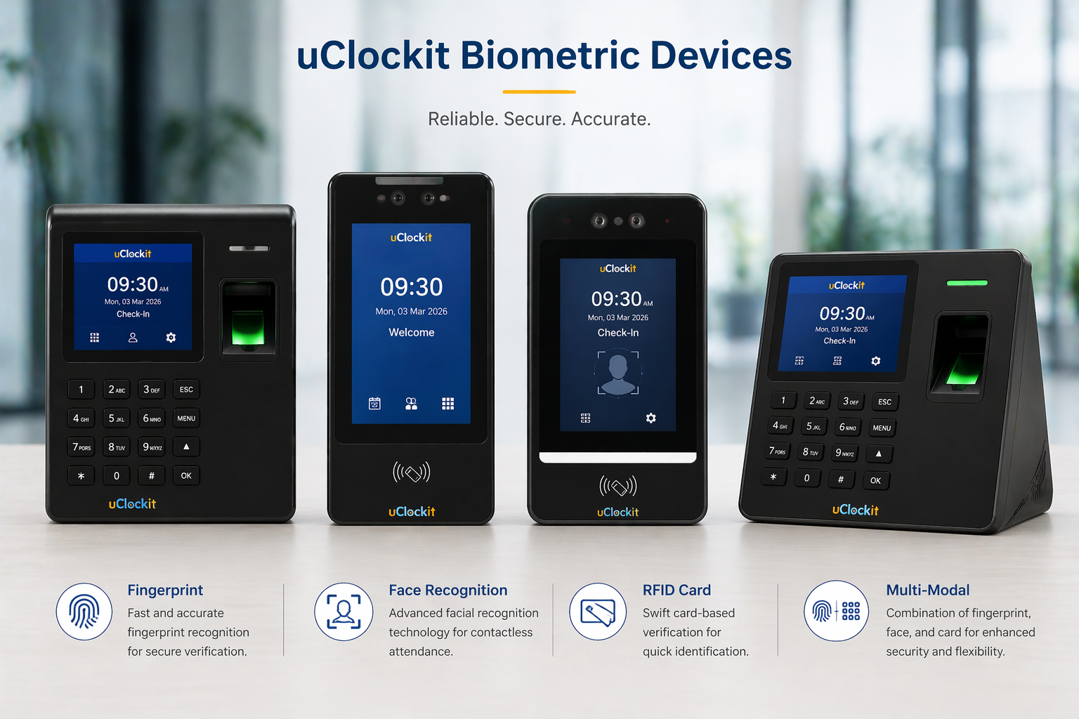 Com a uClockit®, garanta um registo de ponto de forma simples através do telemóvel com geolocalização, através do portal do colaborador e através de equipamentos biométricos externos.